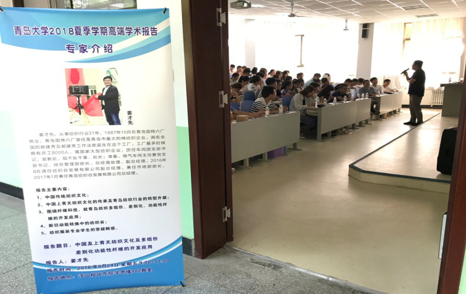 在此次报告中,姜才先总经理向各位老师和学生介绍了中国及其青岛的传统纺织文化和历史、中国上青天纺织文化的传承及青岛纺织行业的转型升级、青岛纺织多组份、差别化、功能性纤维的开发应用以及新旧动能转换中的纺织谷。