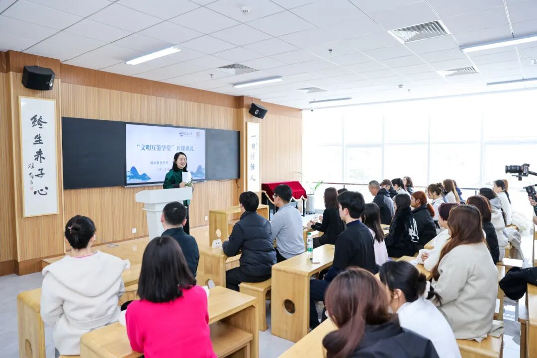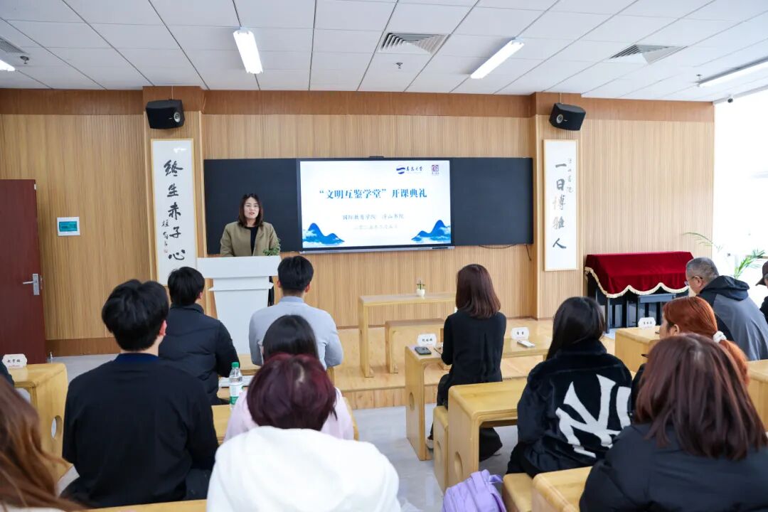 开课仪式由国家大学生文化素质教育基地办公室主任、浮山书院负责人卢文丽主持,创新创业学院常务副院长、教务处副处长席岩;国际教育学院党委书记纪皓瑛、副院长崔云忠等中外师生代表40余人出席,共同见证中华传统文化传承与国际教育创新融合的重要时刻。