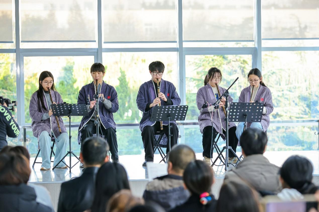 随后,张潇龙老师和四位学子带来洞箫齐奏《远风》,演奏这首作品的学子们历经两期课程的学习,技艺愈加熟练。乐声响起,悠扬空灵,让人听来仿佛置身于山间行走,清风拂面。