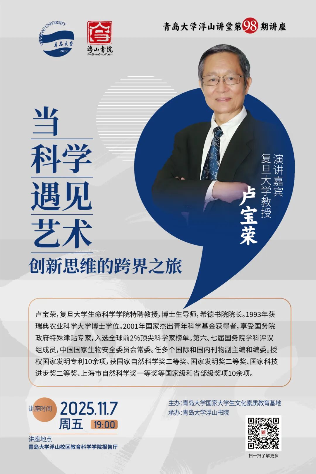 当科学的理性严谨,遇见艺术的感性自由,将碰撞出怎样的创新火花?创新并非无源之水,科学巨人往往也是艺术的挚友。本期浮山讲堂将邀您共赴一场创新思维的跨界之旅,一同探寻:如何借助艺术的滋养,打破思维定式,激发创新灵感,去探索科学的未知之境。