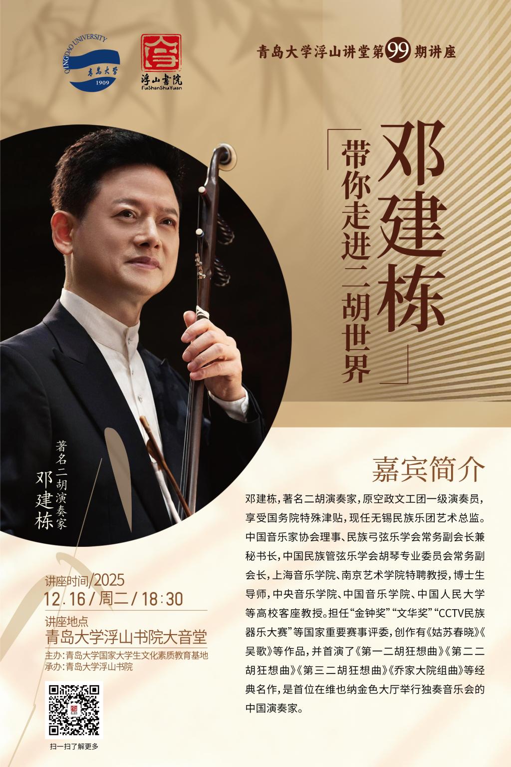 一把二胡,千年回响。著名二胡演奏家、教育家邓建栋先生将亲临现场,以四十余年演奏经验,结合珍贵影像资料与现场演奏,为青大学子开启一场沉浸式国乐文化之旅。讲座将以“历史脉络、代表人物、作品种类、风格传承”为主线,引领学子深度了解二胡艺术的魅力,感受二胡从民间乐器到世界舞台的蜕变历程。