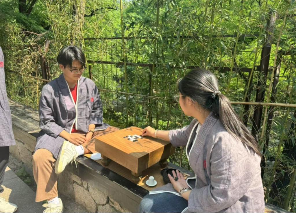 茶会现场,古琴旋律悠扬,如潺潺流水洗涤心灵。同学们围坐一堂,或挥毫泼墨,书写胸中意气;或布局对弈,智慧火花碰撞;或轻拨琴弦,深情诉说心声;或吹箫弄笛,和鸣天籁之音。墨香在空气中弥漫,每一幅书画作品都是同学们对传统文化的致敬与传承。围棋对弈间,智慧的较量无声上演,每一步棋都凝聚着深思熟虑与战略眼光。二胡与箫的合奏,更是将现场氛围推向高潮,深情的旋律诉说着对传统文化的热爱与敬畏。