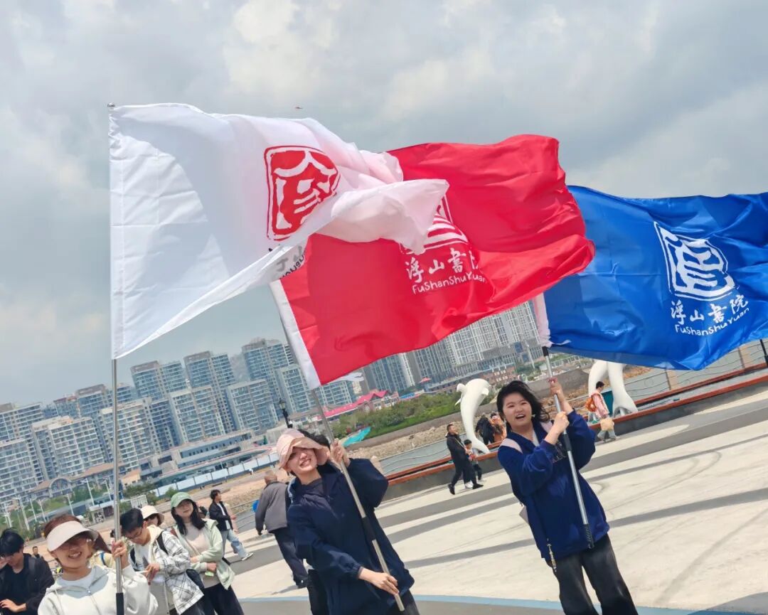 学子们争当旗手,扛着红蓝白三面旗帜,骄傲地展示我们的来处。