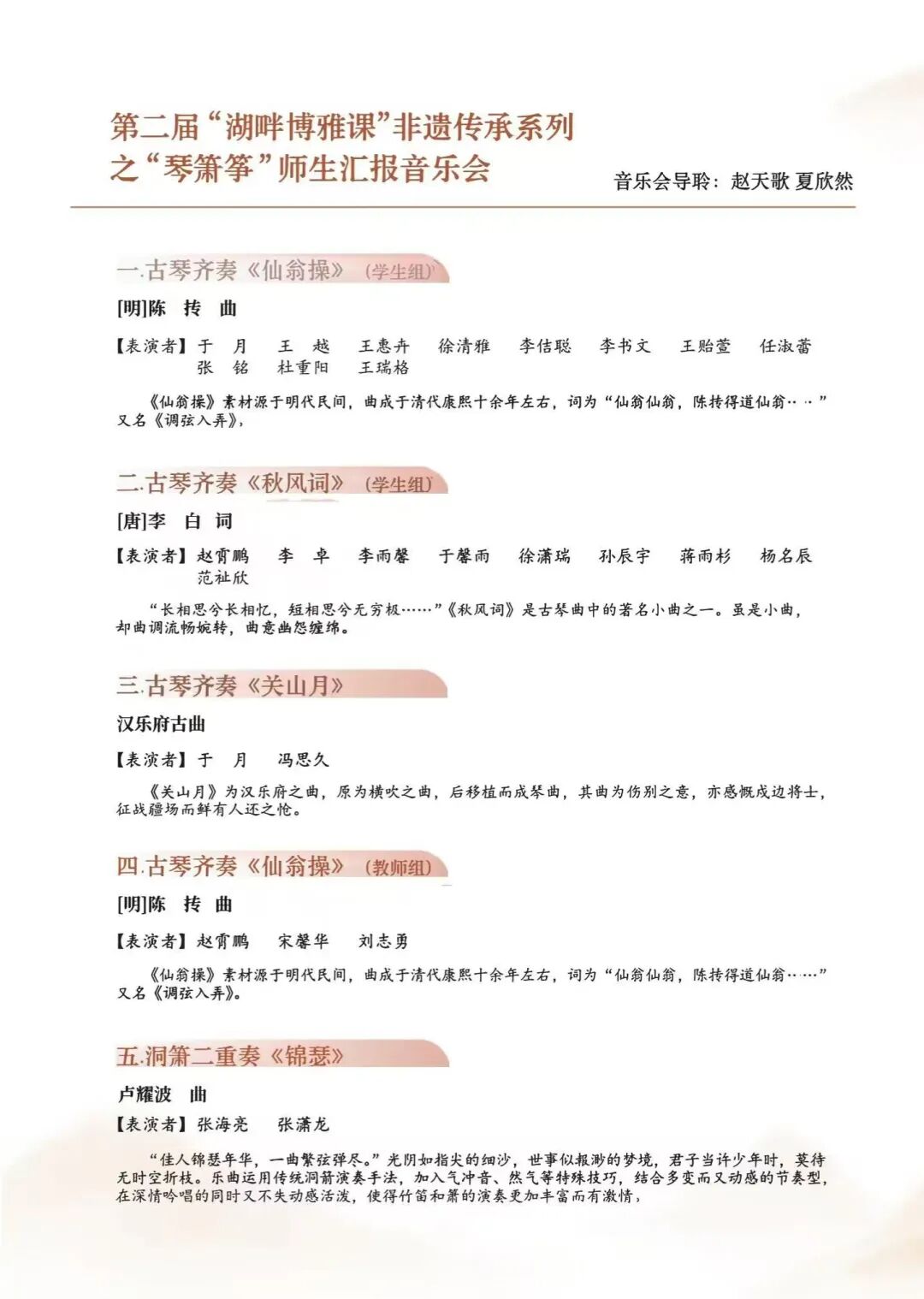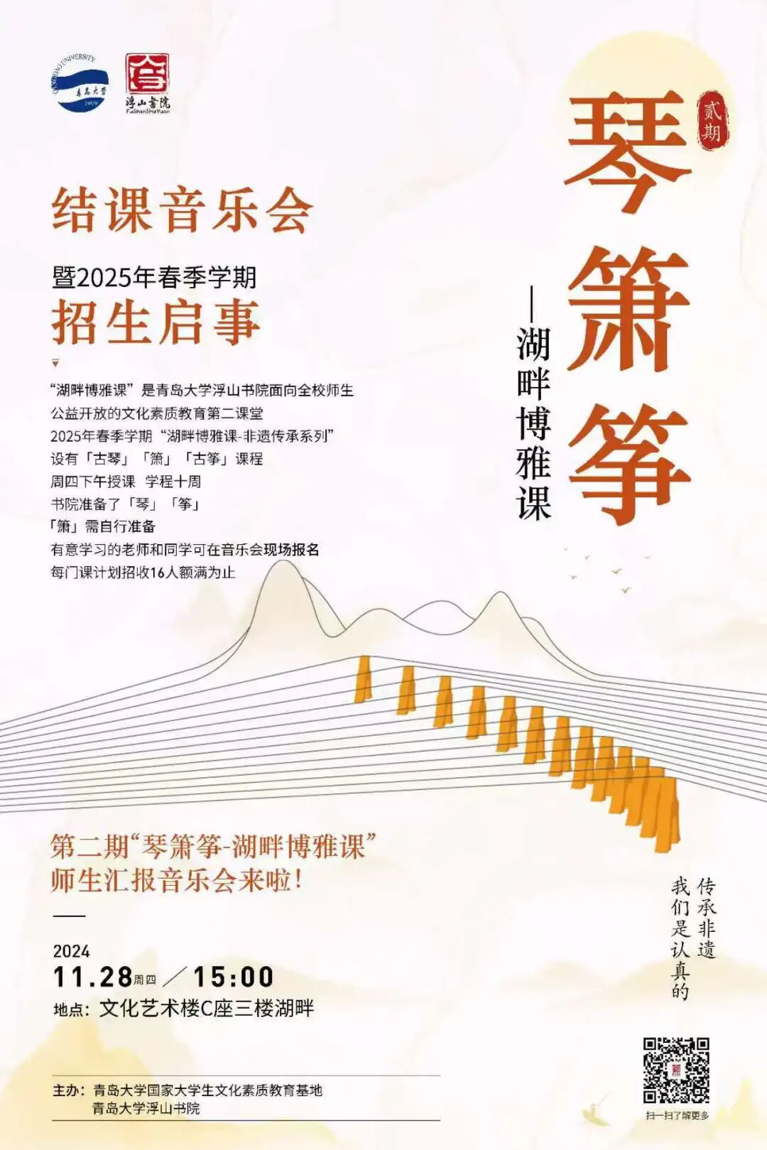 青岛大学浮山书院2025年春季学期“湖畔博雅课”招生报名工作将于音乐会后启动,请有意学习的老师和同学们在音乐会现场进行报名登记,琴、箫、筝每门课计划分别招收16人,额满为止。诚挚欢迎所有热爱中国传统文化,热爱古典音乐的老师同学们前来交流!