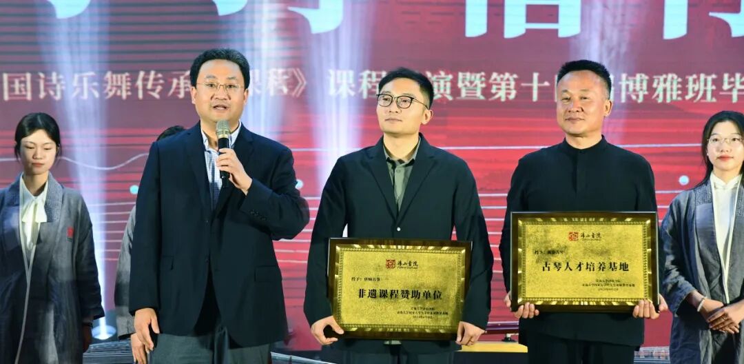为浮山书院捐赠十床古琴的离染古琴董事长陈永东先生和古筝捐赠者唐响古筝董事长齐亚斌先生应邀出席,青岛大学副校长李建波教授为他们颁发了捐赠纪念牌,对他们支持学校美育和非遗文化传承工作的善举表达了感谢。