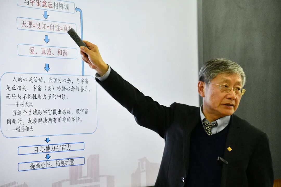 谈及稻盛哲学的文化背景,葛老师介绍道,稻盛先生秉持“敬天爱人”信仰,实践利他经营,其思想根源包括孔孟哲学,并同于阳明学的“致良知”,是现代版本的中国优秀传统文化,而日本企业文化的底层逻辑与根脉就是中国圣贤文化。葛老师还深入企业,研究经营哲学实践问题,研发出导入稻盛哲学的“原浆勾兑”模型,亲自辅导百余家企业导入稻盛哲学。