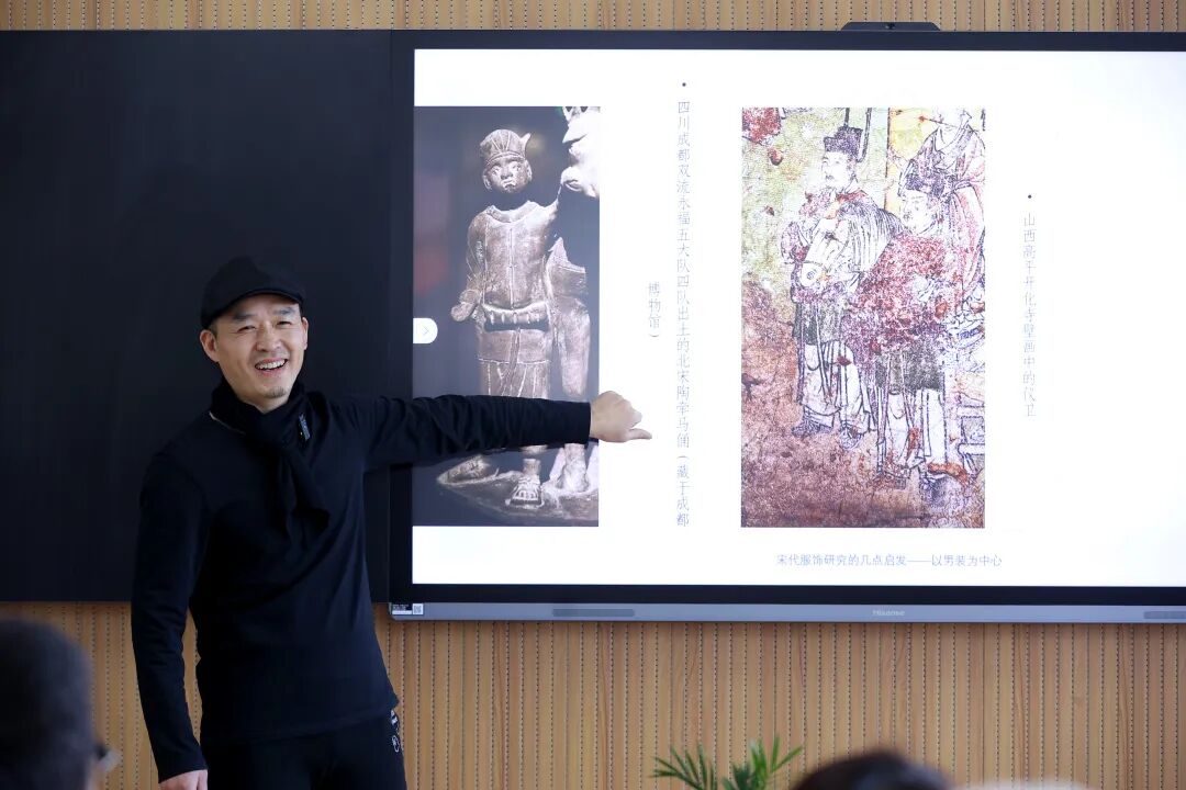 黄智高先生从当代艺术创意之惑引出“古装剧服化道要符合历史真实”的重要观点,强调设计师应懂得中国元素的来由与范畴。他结合出土文物和已有研究成果,就“衣裤装是胡服还是汉服”“十字形剪裁是否一统汉人天下”“隋唐之后下裳是否为女性专利”“陶渊明‘肩搭小袖’是怎样的结构”“北宋是否又开启了一次服饰大变革”等有争议的学术问题发表研究心得,认为“传统服饰从未定型,历代史实证明其一直在演变,不变的是内涵”,传统服饰文化的传承与创新应在深刻理解其来龙去脉的前提下,“弱其形而强其意,轻其构而重其色,去其范而承其艺”,“秉持中华观念、中华方式、中华元素,不离本宗,予以灵活驾驭”。他还指出,面对AI时代的挑战,设计师更应不断深研传统服饰文化,将传统价值观与美学意蕴融入现代服饰设计,守住艺术设计的“独门绝技”。