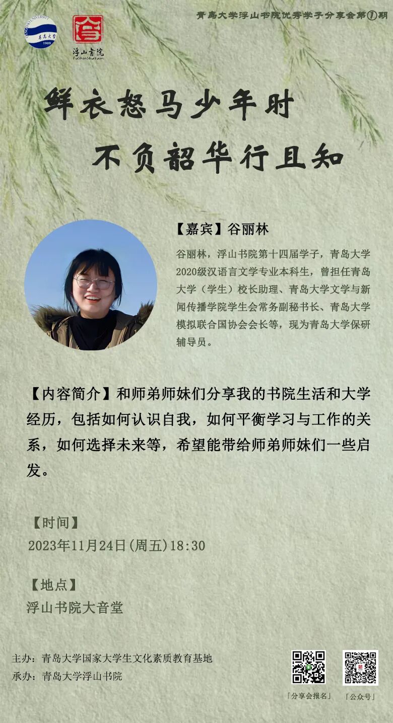 谷丽林,浮山书院第十四届学子,青岛大学2020级汉语言文学专业本科生,曾担任青岛大学(学生)校长助理、青岛大学文学与新闻传播学院学生会常务副秘书长、青岛大学模拟联合国协会会长等,现为青岛大学保研辅导员。