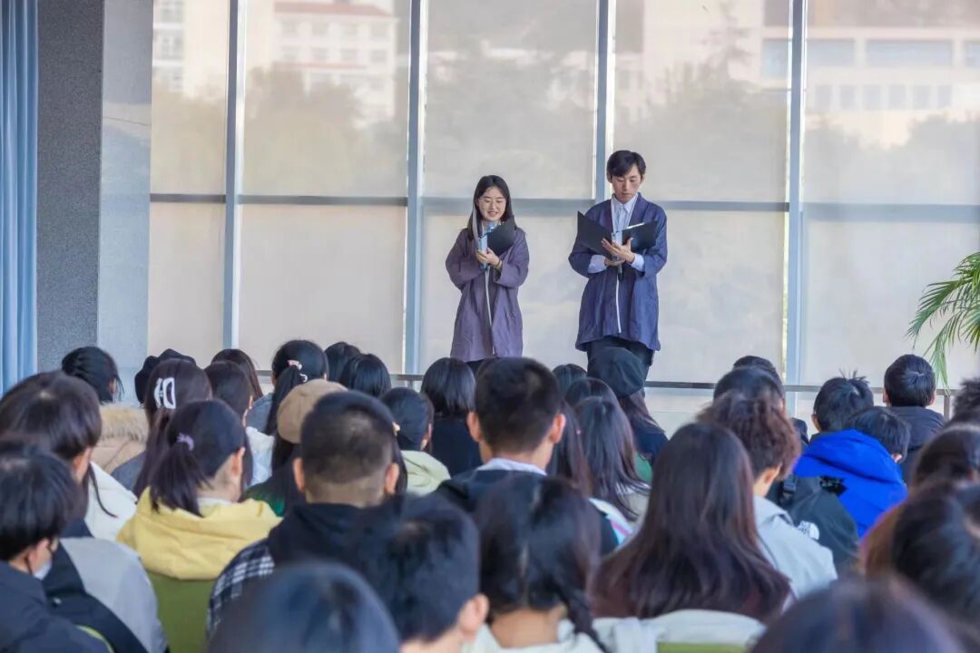 第十六届学子代表带来诗朗诵《青春万岁》,表达了迎接师弟师妹们的欣喜之情,希望与师弟师妹们一起在如火的青春时光,遇见更美好的自己和更广阔的世界。