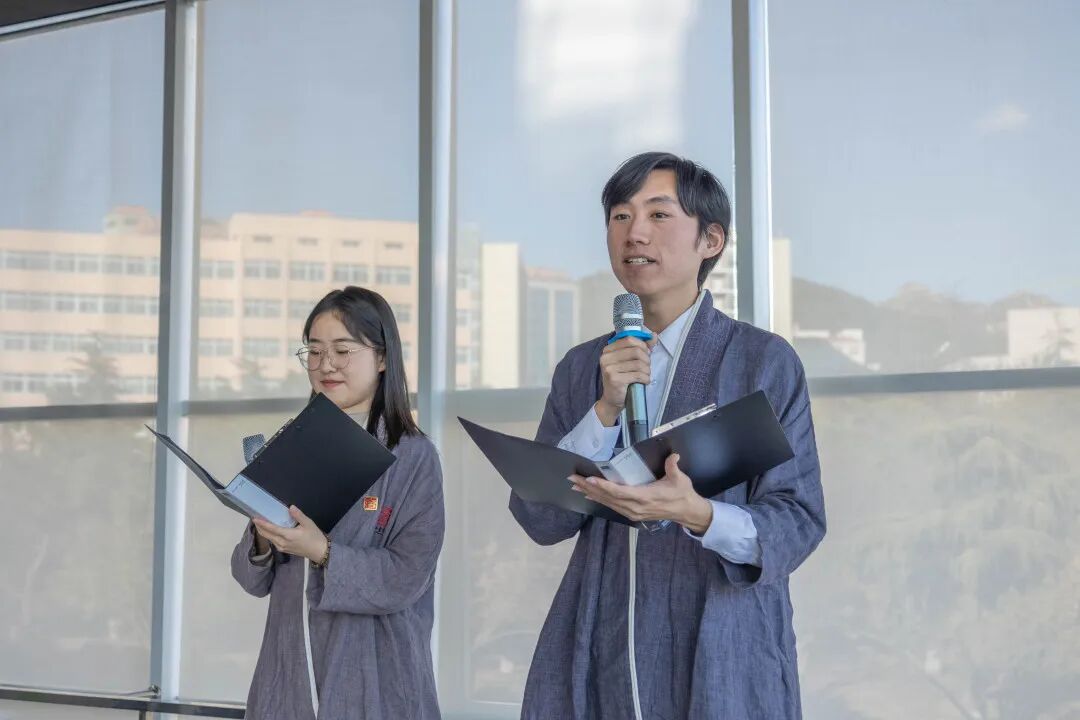青岛大学教务处副处长李传军老师、青岛大学国家大学生文化素质教育基地(浮山书院)负责人卢文丽老师、浮山书院修业导师丁洁玉老师及孙莉老师出席典礼。浮山书院第十六届学子隋云婷、第十七届学子高紫阳主持典礼。